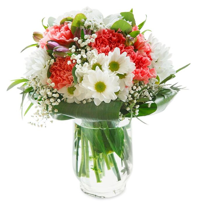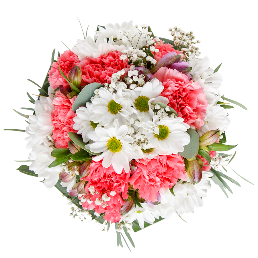 Our radiant and graceful flower arrangement is designed to impress. Featuring a beautiful blend of snow-white chrysanthemums, light and fluffy gypsophila, and soft pink carnations, all interwoven with lush aspidistra leaves.